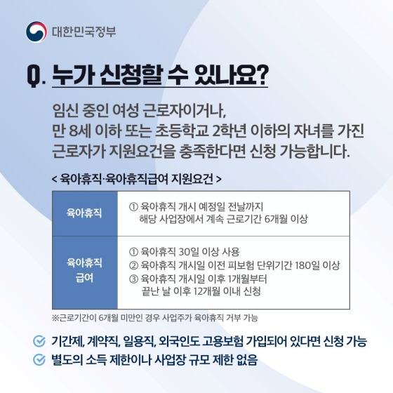 - 자녀가 8세 이하이거나 초등학교 2학년 이하인 경우 신청 가능합니다.